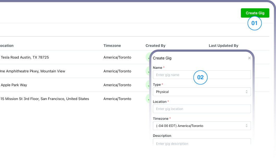 Navigate to the top right corner to locate the Create Gig button and fill your gig details.